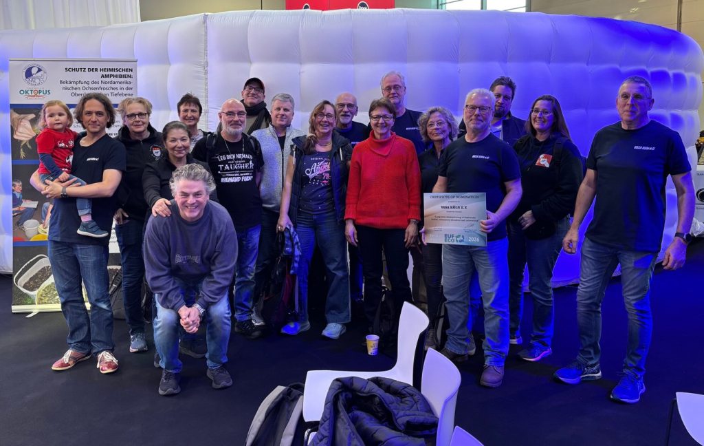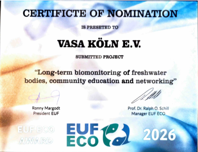 Aus der Pressemitteilung: Den dritten Platz des EUF ECO AWARD 2026 belegte der VASA Köln e. V., deren Sporttaucherinnen und Sporttaucher seit 2001 ehrenamtlich Gewässer wie den Fühlinger See untersuchen. Regelmäßige Monitoring-Aktionen von Flora, Fauna und Wasserparametern tragen dazu bei, ökologische Veränderungen frühzeitig zu erkennen und die Stabilitat der Gewasser zu erhalten. Dr. Andreas Küver, 1. VASA Vortsitzender, hat das Zertifikat auf der boot 2026 entgegengenommen.